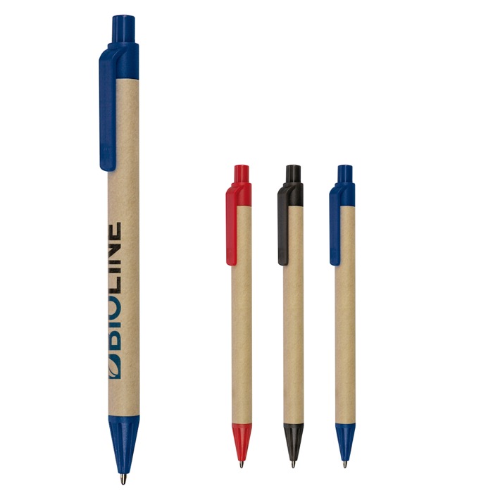 Penna a sfera in carta biologica con parti in plastica ABS e AS. Con clip, pulsante e punta colorati. Inchiostro X-20 blu.