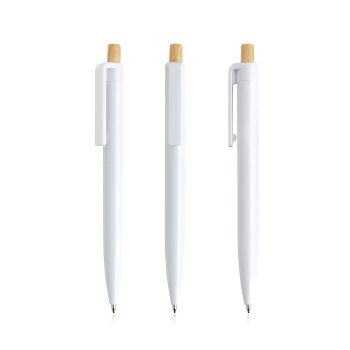 Penna in plastica riciclata con pulsante in bambù eco-friendly.