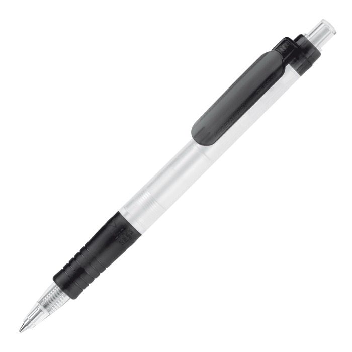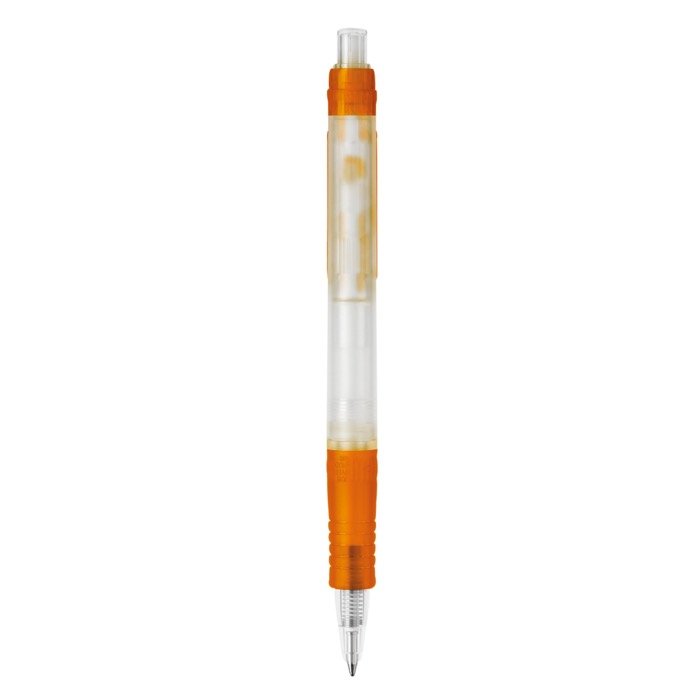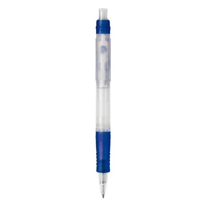 Penna trasparente ecologica in bioplastica, inchiostro blu, stile italiano.