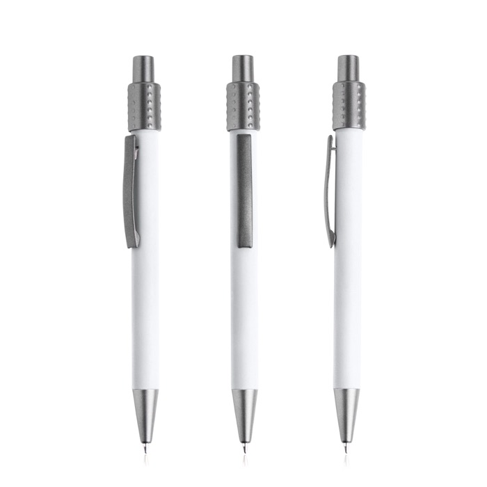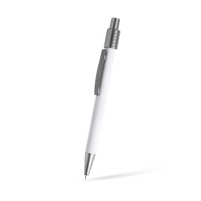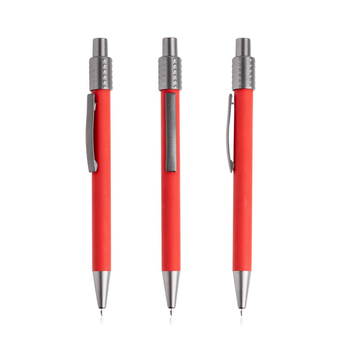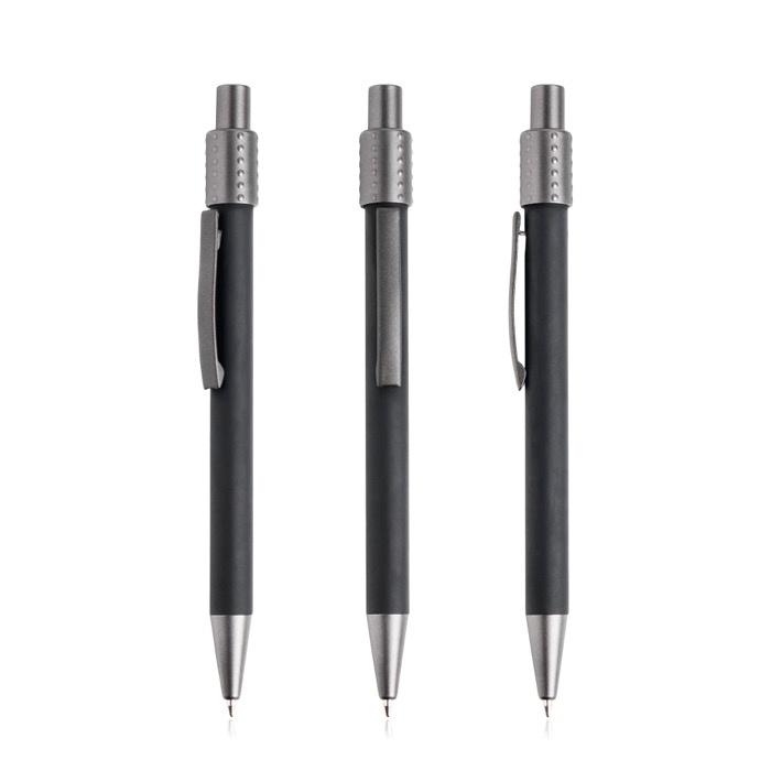 Penna a sfera in alluminio con finitura gommata per una scrittura comoda nell’uso quotidiano. Integra punta e pulsante in plastica e una clip in acciaio inox che aumentano la resistenza e donano un look moderno in ufficio o in fiera. Nella parte superiore incorpora uno spinner pensato per alleviare lo stress mentre prendi appunti o aspetti una riunione. Include inchiostro blu con ricambio tipo JUMBO e un peso leggero di 15g, facile da portare in tasca o con il badge. Consigliata per attività di branding e regali aziendali.
