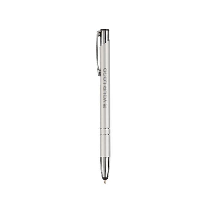 Penna in alluminio con puntatore per schermo touch e inchiostro di scrittura blu, pensata per l’uso quotidiano in ufficio e durante le visite commerciali. Consente di prendere appunti con un tratto scorrevole e, allo stesso tempo, di interagire con smartphone e tablet senza sporcare lo schermo. Il corpo metallico offre una sensazione solida in mano e una buona presenza durante le riunioni. L’uso è semplice e pratico per i team che alternano carta e dispositivi. Consigliata per fiere, formazioni e azioni di branding con logo.