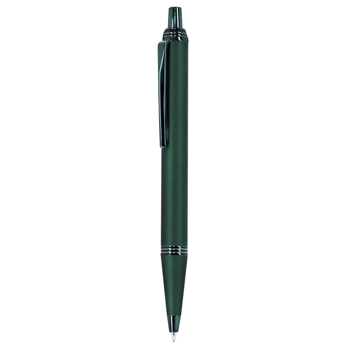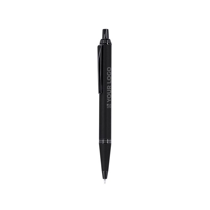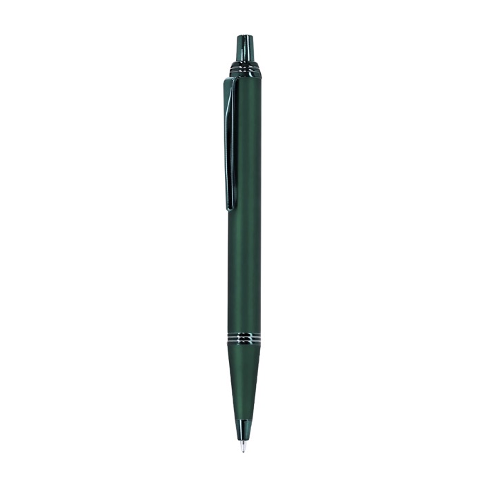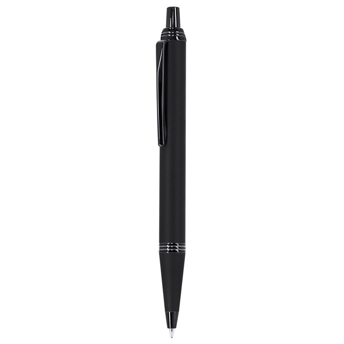 Penna con corpo in alluminio, finitura gommata e dettagli cromati. Meccanismo a pressione, refill jumbo e inchiostro blu.