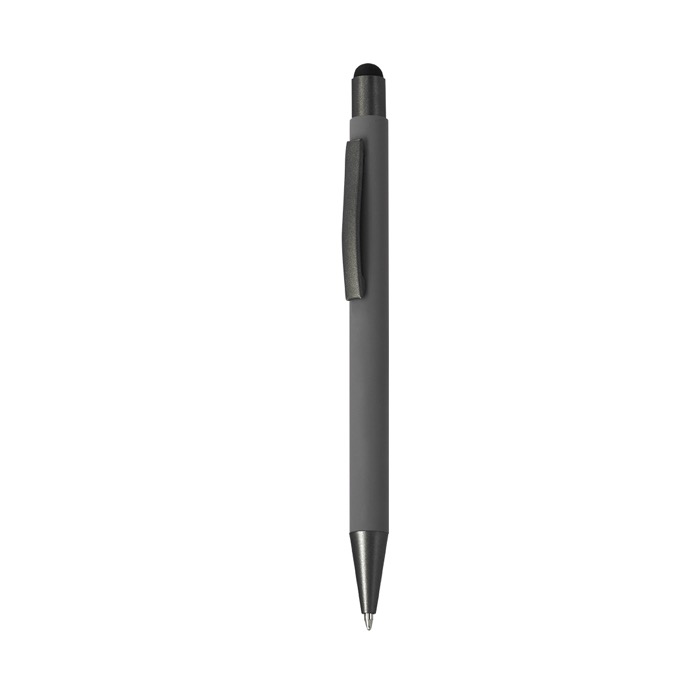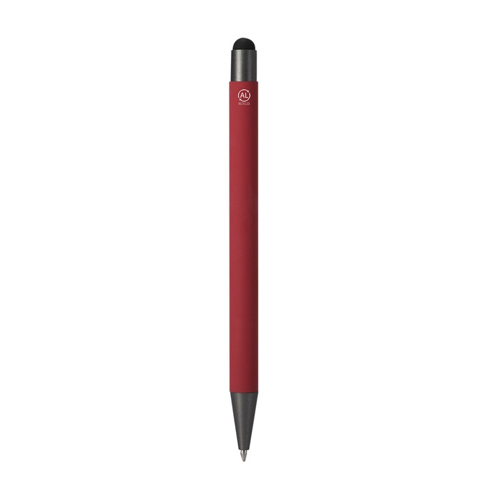 Penna in alluminio riciclato con gommino e meccanismo a scatto, pensata per l’uso quotidiano in ufficio e durante eventi. È dotata di clip e pulsante metallici con finitura gun metal e un gommino abbinato per schermi touch. Il fusto presenta una finitura in gomma che migliora la presa e facilita l'incisione laser, mantenendo un risultato pulito e leggibile. Include un distintivo in alluminio riciclato nella parte superiore. Funziona con cartuccia jumbo e scrittura con inchiostro blu, utile per attività di branding e fiere.