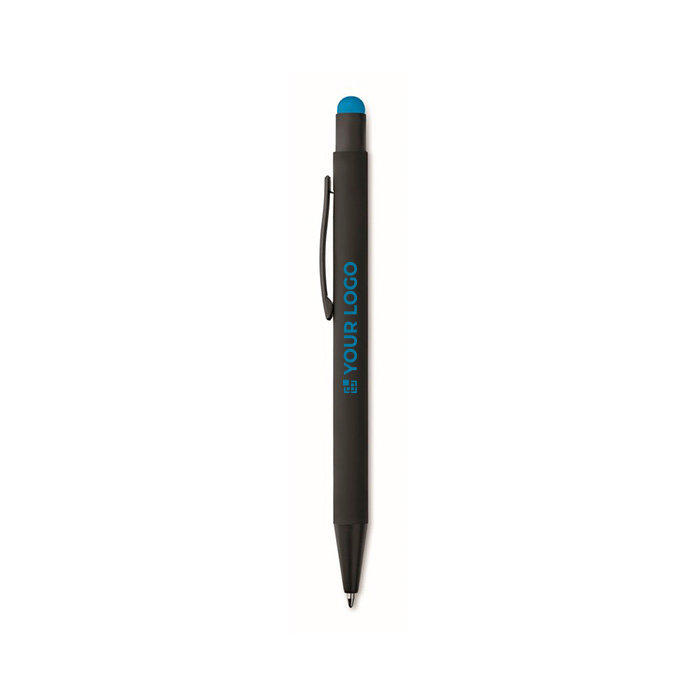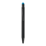 Penna biro personalizzabile in alluminio di colore nero con gommino touch screen di cui potete scegliere il colore tra sei varianti. Inchiostro blu.
