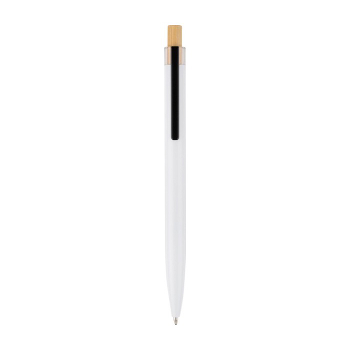 Penna in alluminio riciclato laccato con pulsante in bambù, decorazione in plastica riciclata e clip metallica per un uso quotidiano confortevole in ufficio. Include il logo del riciclo inciso al laser e offre una scrittura di circa 700 metri con inchiostro blu, utile per lunghe giornate, formazione o reception. Viene fornita in una bustina di plastica per facilitare la consegna in azioni aziendali. Opzione pratica da personalizzare e utilizzare in fiere, eventi interni o campagne di marca.
