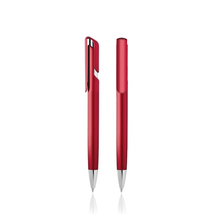Penna di plastica dai colori metallizzati, corpo colorato con dettagli argentati e clip largo. Meccanismo a pulsante. Inchiostro blu.