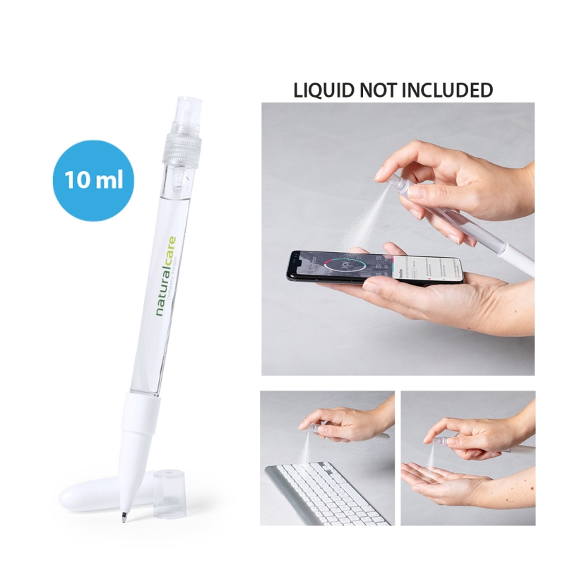 Queste penne personalizzabili con il tuo logo possono contenere fino a 10ml di liquido disinfettante nel loro fusto, che puoi spruzzare per igienizzare.