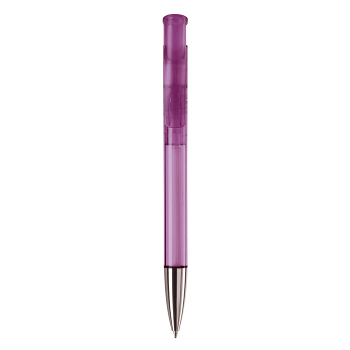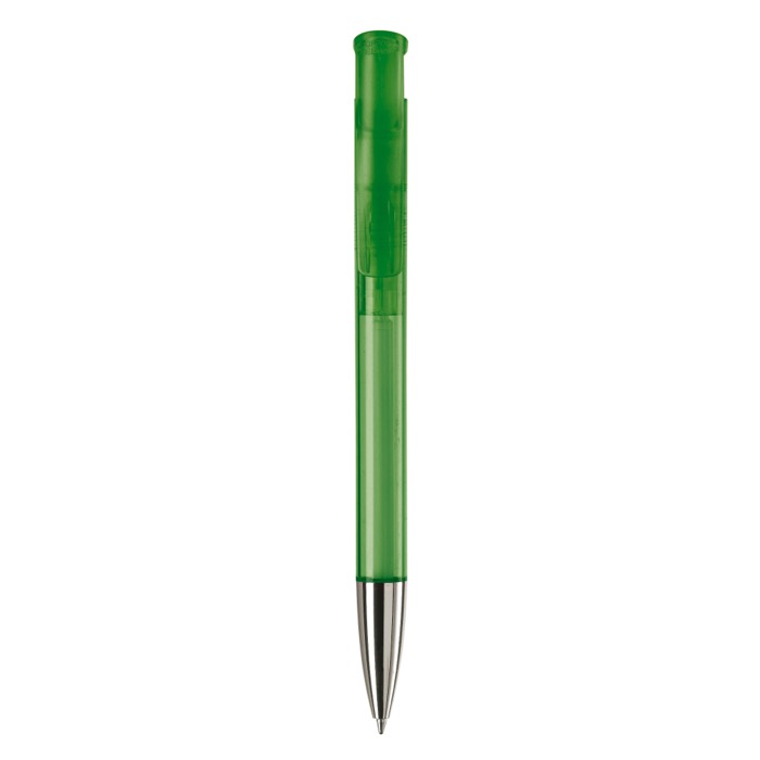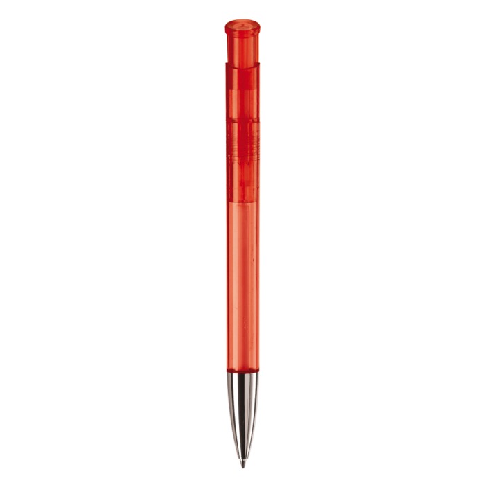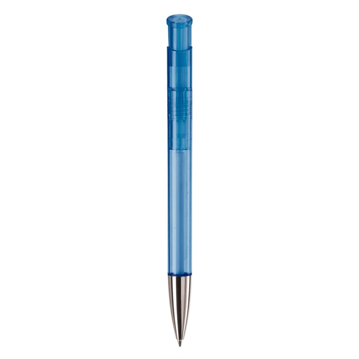 - Design trasparente con robusta punta metallica e inchiostro blu.
