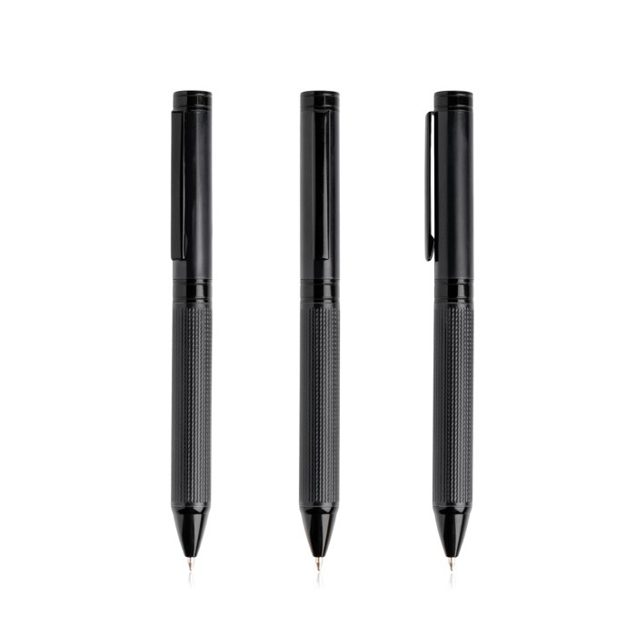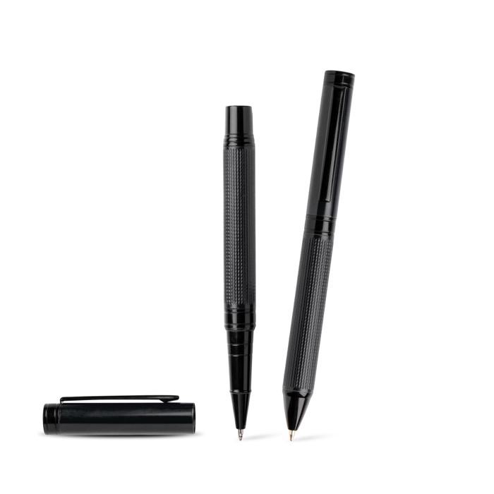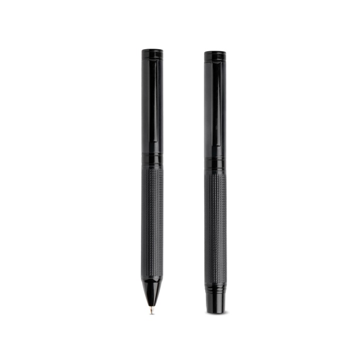 Set composto da penna a sfera e penna roller, con parte superiore in acciaio inox laccato e parte inferiore in alluminio con texture in rilievo per una presa ergonomica. Dettagli in metallo nero che esaltano l’estetica premium. Presentato in un elegante astuccio nero in cartone rigido con interno in velluto nero e custodia esterna bianca per un trasporto sicuro. Inchiostro blu. Ideale come regalo aziendale o per occasioni speciali.