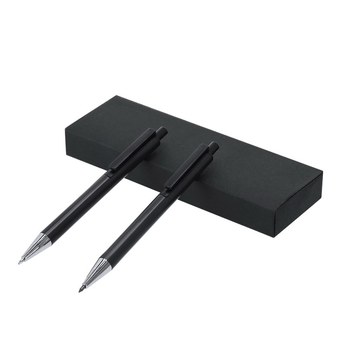 Set da scrittura realizzato in alluminio riciclato, composto da una penna a inchiostro blu e una matita eterna per una scrittura continua. Entrambi integrano un meccanismo a pulsante per un utilizzo rapido nella quotidianità, con clip abbinata e dettagli cromati che ne facilitano il trasporto in un taccuino o in tasca. Si presenta in un astuccio nero in cartone riciclato, pronto per la consegna in attività aziendali. Opzione pratica per fiere, formazioni interne o come omaggio di benvenuto con il tuo logo.