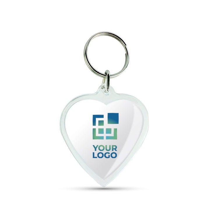 Aggiungi un tocco romantico e speciale al tuo marchio, con questo portachiavi a forma di cuore in acrilico, personalizzabile con un inserto di carta su i 2 lati.