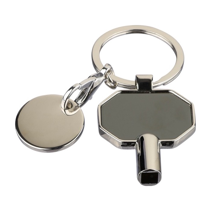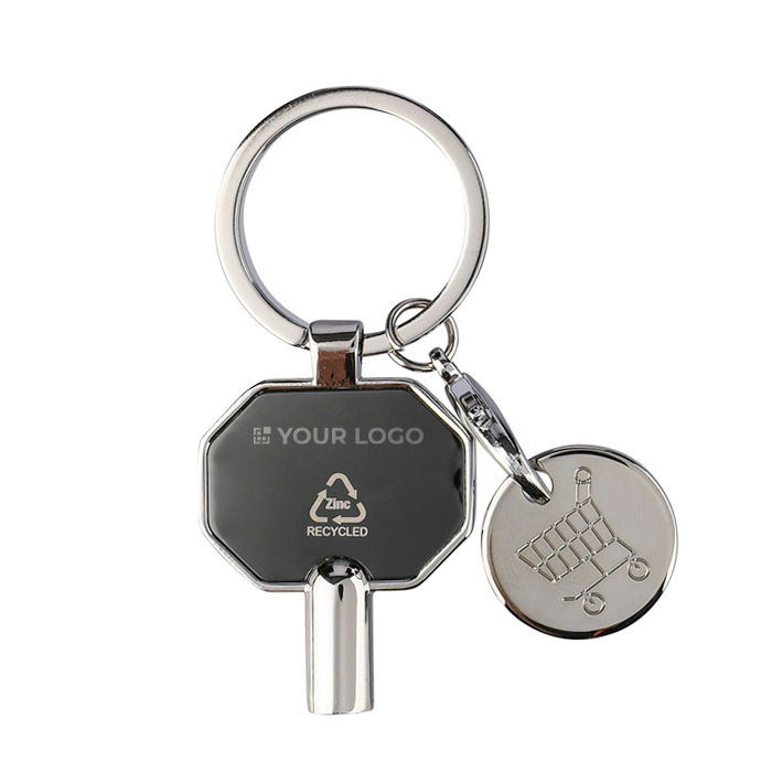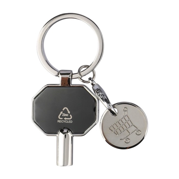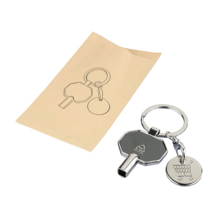 Portachiavi in lega di zinco riciclata con chiave di sfiato per radiatori e gettone per la spesa, pensato per un uso quotidiano in contesti professionali. Integra una chiave quadrata da 5x5 mm, misura comune in Europa per la manutenzione dei radiatori, e un anello metallico resistente per portarlo con chiavi o badge di accesso. Include il logo del riciclo e viene consegnato in una custodia di carta singola, all'interno di una busta in cartone marrone con illustrazione. Adatto per campagne di manutenzione, fiere tecniche o azioni di marca nelle sedi.