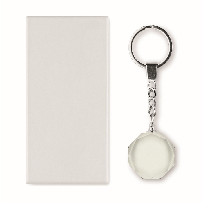 Portachiavi rotondo in vetro per premi. Confezionato in scatola regalo.