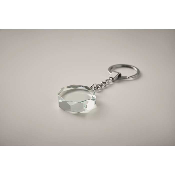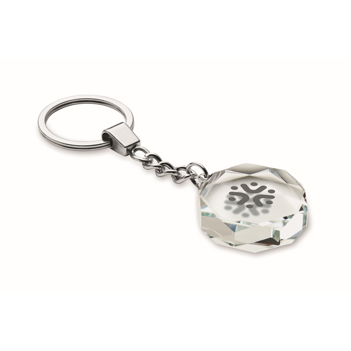 Portachiavi rotondo in cristallo con finitura geometrica unica che ricorda una gemma. Un omaggio sorprendente grazie al suo design originale.