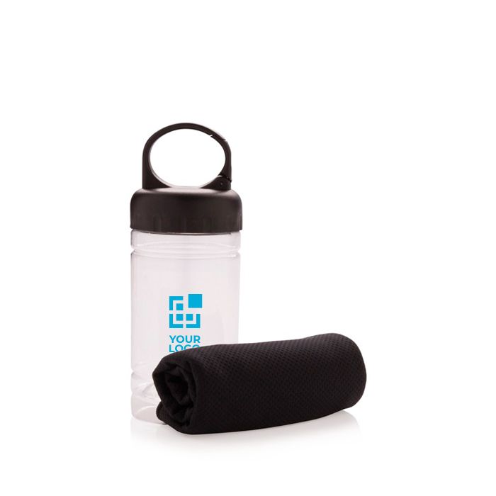 Asciugamano refrigerante in microfibra, con protezione solare al 98%. Si rinfresca facilmente aggiungendo acqua fredda nella borraccia in PP con moschettone integrato.