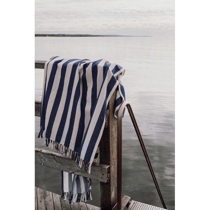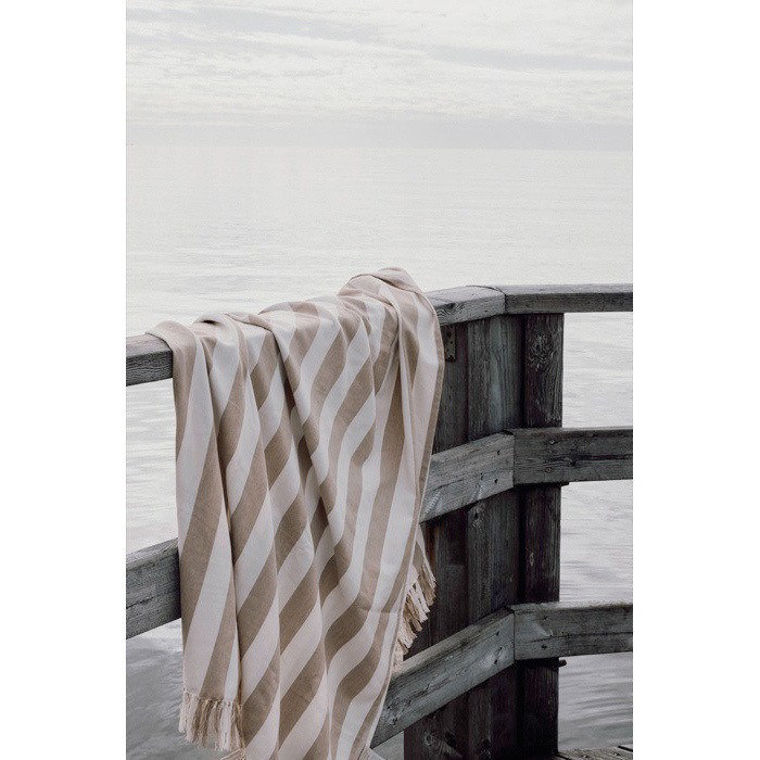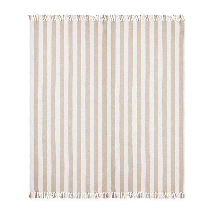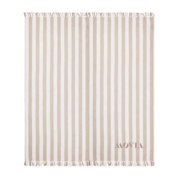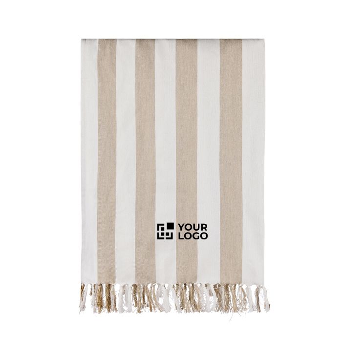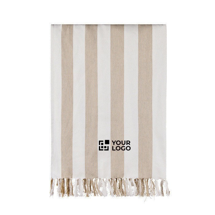 Telo hammam extra large con righe bicolore e frange. Rendi il tuo brand protagonista di campagne estive ed eventi all’aperto.