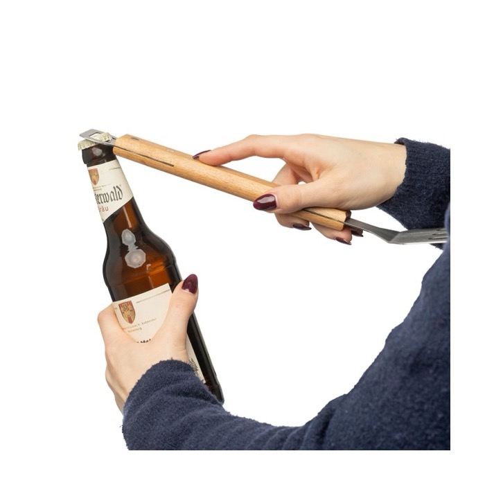 Spatola da barbecue in acciaio inox con manico in legno di faggio e apribottiglie integrato all’estremità. Il formato offre una presa comoda e una gestione stabile durante la cottura alla griglia, mentre l’apribottiglie aggiunge un extra pratico per servizi di catering o eventi. Opzione interessante per la personalizzazione con logo e per l’uso come omaggio in campagne estive, fiere o attività interne.