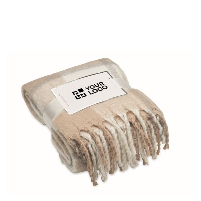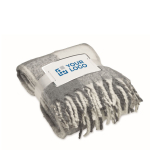 Aggiungi un tocco di eleganza e sostenibilità alla tua offerta, scegli una coperta in rPET mohair. Il suo disegno a quadri e le frange realizzate a mano conferiscono un'estetica raffinata, rendendola un regalo aziendale di pregio. Presentata con nastro e biglietto personalizzabile, comunica cura e attenzione ai dettagli. Questo plaid non solo offre calore e comfort, ma posiziona il tuo brand come attento all'ambiente e al buon gusto, rafforzando la tua immagine con un oggetto di valore.