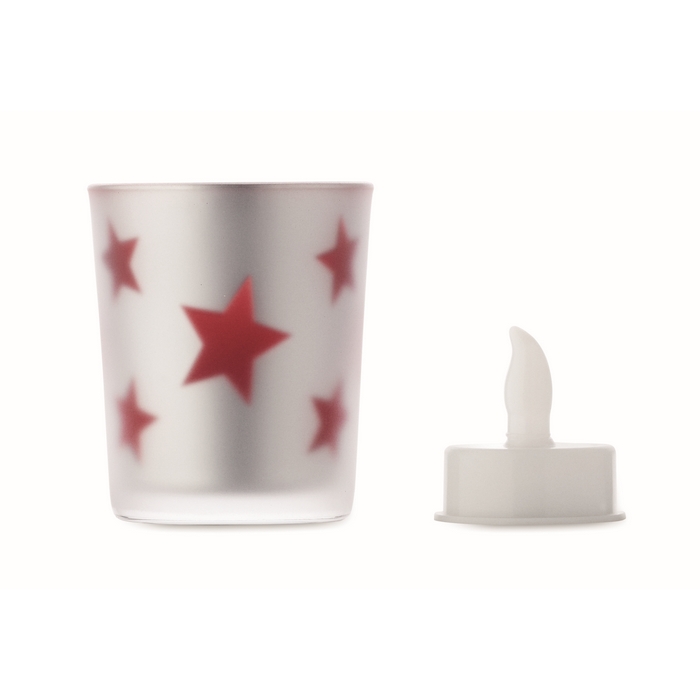 Una candela a LED in barattolo di vetro con stelline natalizie illumina il tuo brand con un'atmosfera calda e sicura. Questa soluzione decorativa, senza fiamma e duratura grazie alla batteria inclusa, crea un ambiente accogliente negli spazi dei tuoi clienti e collaboratori. Personalizzala con il tuo logo per associare il tuo brand a momenti di relax e festività. È un modo distintivo per rafforzare la tua presenza durante le feste, offrendo un regalo che porta luce e un ricordo duraturo della tua azienda. Un gesto luminoso e premuroso. 1 batteria a bottone CR2032 inclusa.