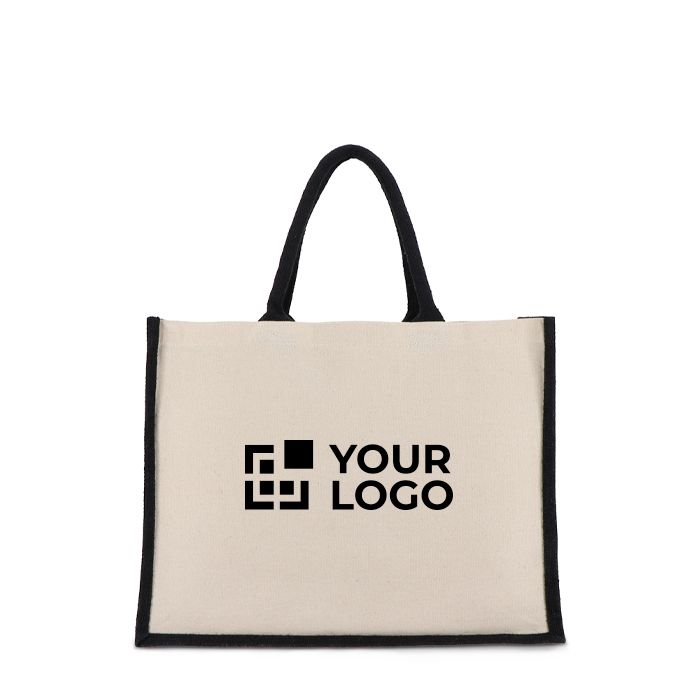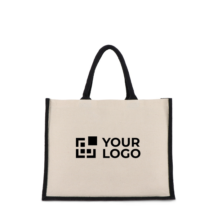 Eleva l’estetica dei tuoi eventi e promozioni con un tocco distintivo grazie a questa borsa in tela di cotone e juta. Manici coordinati con base e lati.