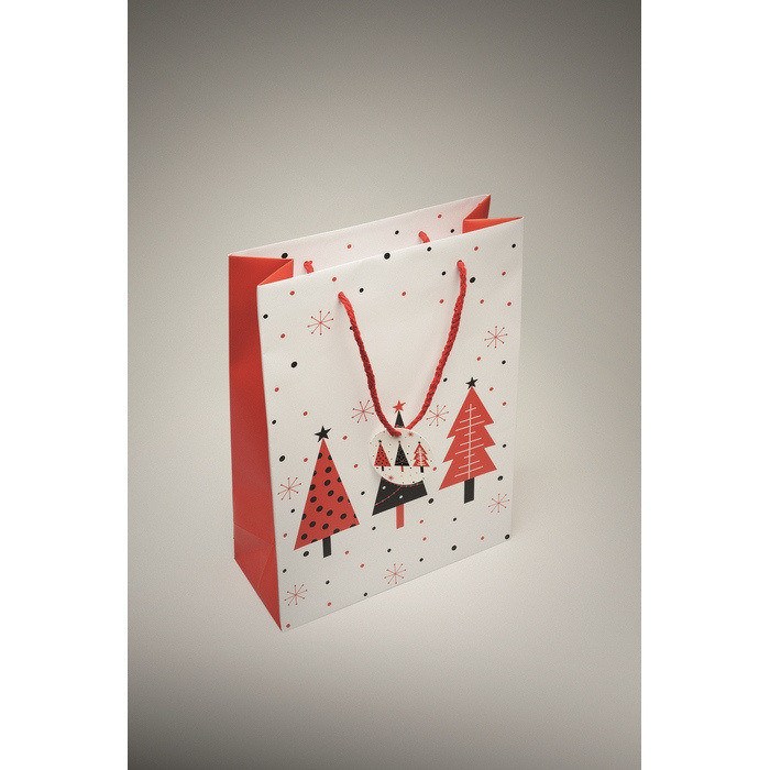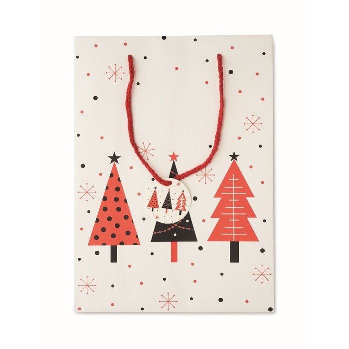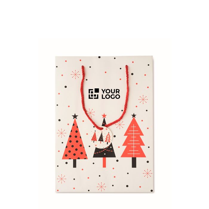 Per far risaltare il tuo brand durante le festività, una borsa regalo di carta a tema natalizio grande, con etichetta inclusa e certificazione FSC, è una scelta di stile. Realizzata con carta da 150g/m2 e personalizzata con il tuo logo, questa borsa non solo trasmette allegria, ma comunica anche il tuo impegno per la gestione forestale responsabile. Ti permette di rafforzare il tuo brand, associandolo a festività e sostenibilità. È un modo efficace per distinguerti e lasciare un'impressione positiva e duratura.