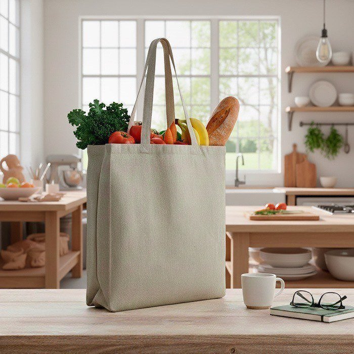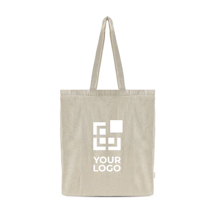 Borsa in cotone riciclato mélange in tonalità naturale chiara, pensata per un uso frequente. Include un soffietto completo per aumentare la capienza e facilitare il trasporto di oggetti voluminosi senza perdere stabilità. Il tessuto è ottenuto da ritagli di stoffa riutilizzati, offrendo una finitura resistente e un aspetto uniforme. I manici lunghi consentono di portarla comodamente a spalla, sia in interno sia all’esterno. Opzione pratica per attività di branding in fiere, eventi, negozi o campagne interne.
