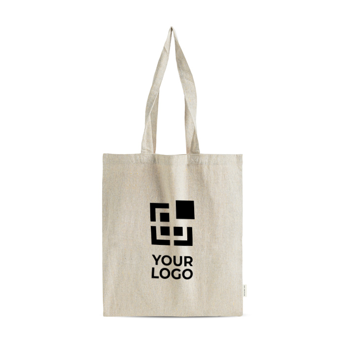 Borsa in cotone riciclato melange con manici lunghi, tonalità naturale e resistenza fino a 8 kg. Porta il tuo logo a fiere e in ufficio con una presenza sobria.