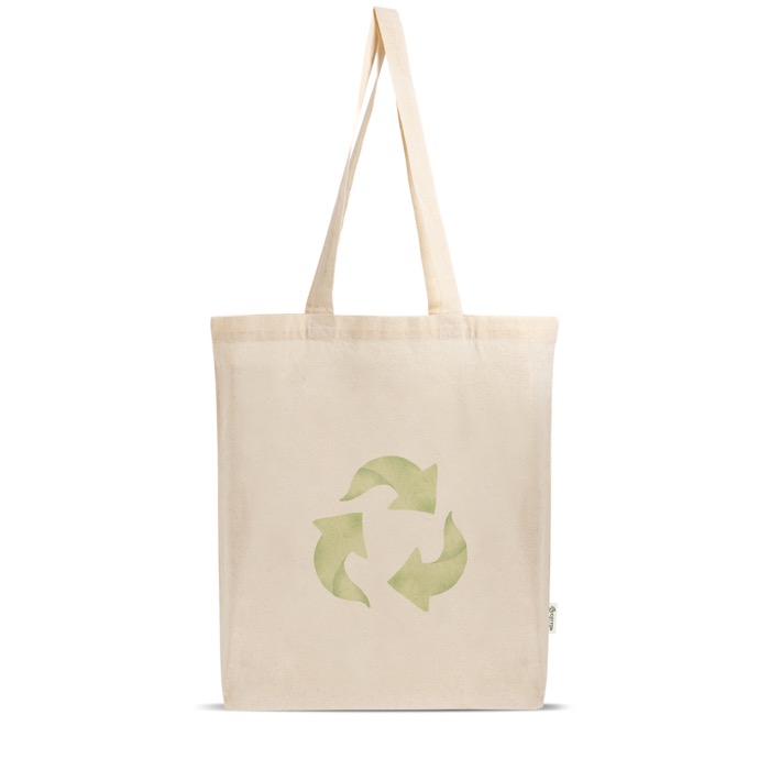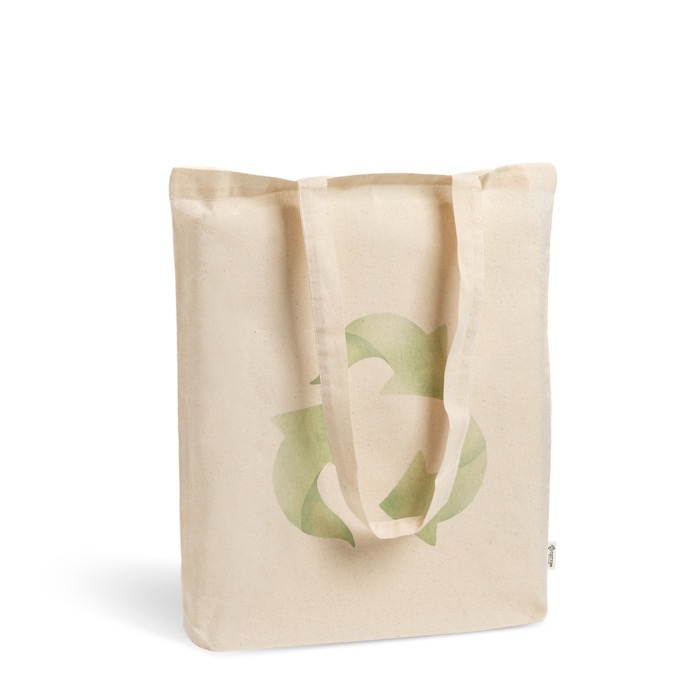 Borsa in cotone riciclato e plastica riciclata, con soffietto sul fondo per aumentare la capacità e migliorare la stabilità quando appoggiata a terra. Include manici lunghi per portarla comodamente a spalla e una resistenza fino a 9kg, pensata per l’uso quotidiano con la spesa, libri o materiali di lavoro. Il tessuto da 140g offre un buon equilibrio tra leggerezza e durata, facilitandone il riutilizzo continuativo. Un’opzione pratica per fiere, azioni di street marketing e consegne di documentazione aziendale.