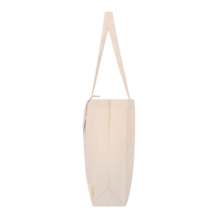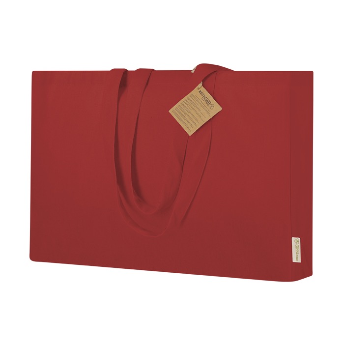 Borsa con soffietto e manici lunghi rinforzati per far viaggiare il tuo logo con te ogni giorno. Il cotone riciclato 220g/m2 e la resistenza di 10kg ti permetteranno di stare al passo.