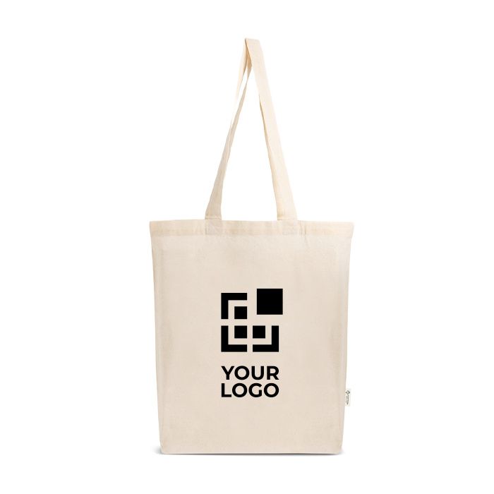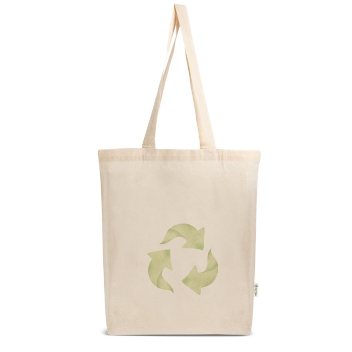 Borsa in cotone riciclato e plastica riciclata con soffietto completo, per aumentare la capienza e mantenere la base stabile. I manici lunghi facilitano il trasporto a spalla negli spostamenti quotidiani, in fiera o durante visite commerciali. Supporta fino a 9kg, quindi è pratica per trasportare cataloghi, libri, la spesa o materiale da ufficio senza deformarsi facilmente. Il tessuto da 140g offre un buon equilibrio tra leggerezza e resistenza. Opzione utile per azioni di visibilità del brand in eventi e punti vendita.