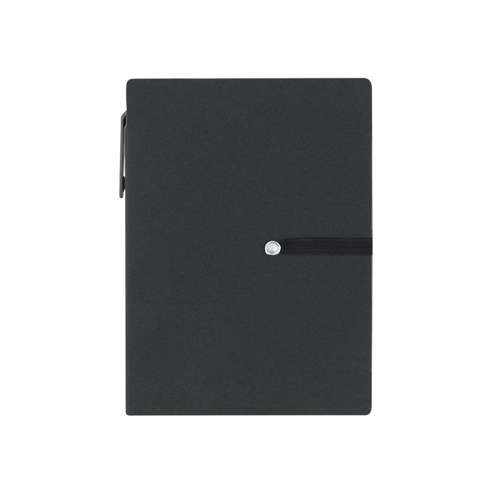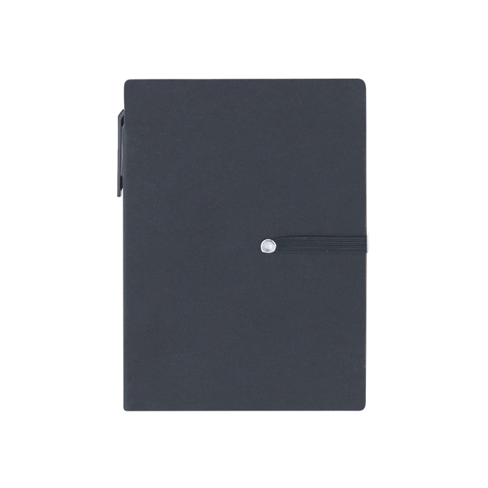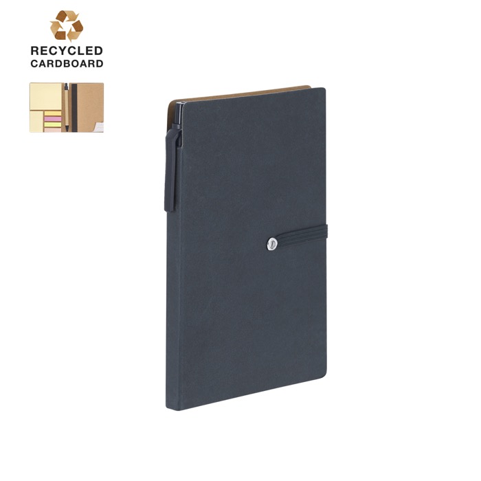 Blocco A6 in cartone riciclato con copertina rigida e chiusura tramite elastico coordinato. Include un blocco da 70 fogli bianchi rigati per prendere appunti quotidiani in modo ordinato. All’interno della copertina include note adesive gialle in due formati e 100 mini note adesive in vari colori per segnare attività, definire priorità e lasciare promemoria rapidi. Completa il set una penna a inchiostro blu con meccanismo a scatto. Consigliato per corsi di formazione, eventi e materiale da ufficio con logo.