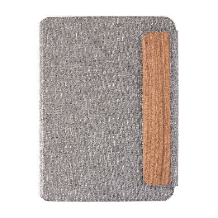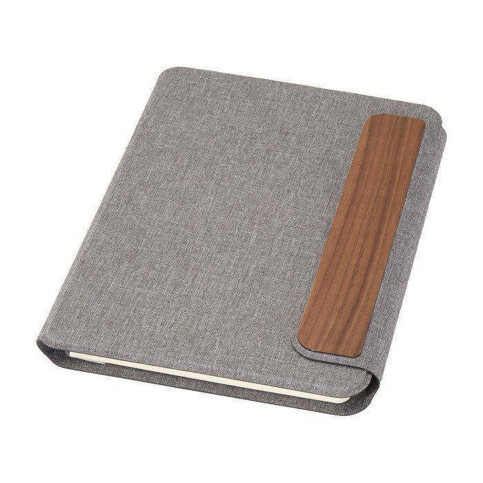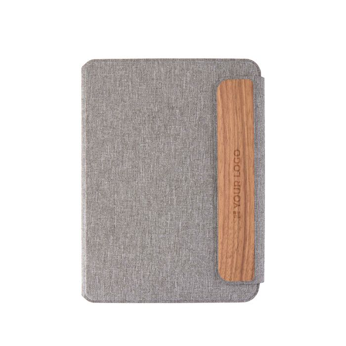 Il portadocumenti formato A5 è parzialmente realizzato in poliestere riciclato post-consumo certificato RCS, che offre un'alternativa più sostenibile riducendo la dipendenza da materiali vergini. Progettato con un'elegante copertina rigida grigia con angoli arrotondati e tecnologia di saldatura di precisione, è fissato con una chiusura magnetica accentuata da una raffinata decorazione in legno di noce, che conferisce un tocco moderno e sofisticato. All'interno è presente un blocco note rimovibile con copertina morbida e 64 fogli a righe color crema, realizzati con carta da 80 g/m2 proveniente da fonti responsabili. Fornito in una custodia colorata in carta kraft.