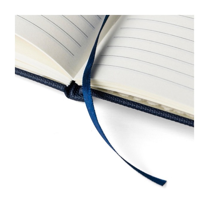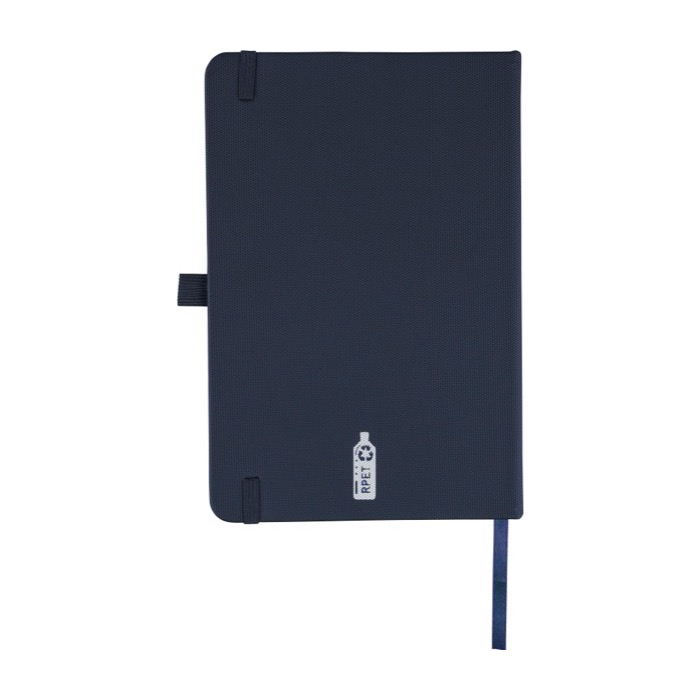 Taccuino in poliestere da plastica riciclata con rivestimento in similpelle, in formato A5 per appunti di lavoro e riunioni. Include 80 fogli a righe da 70 g/m², pensati per una scrittura fluida nella quotidianità. È dotato di segnalibro, elastico di chiusura e portapenne per avere tutto a portata di mano. La copertina semirigida offre una migliore protezione in zaini e valigette, e il logo del riciclo è stampato in rilievo sulla quarta di copertina. Utile per congressi, onboarding e attività di branding con logo.