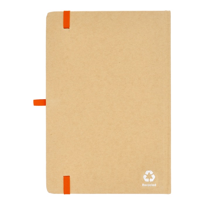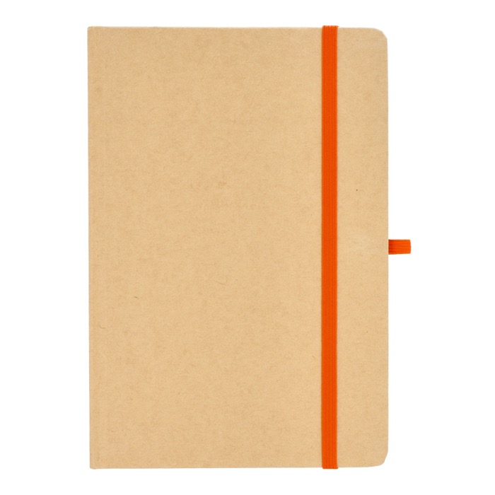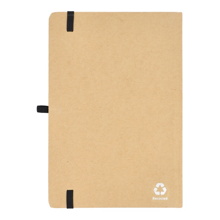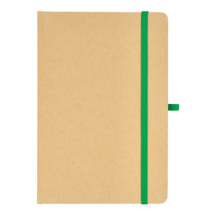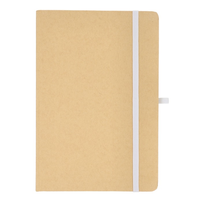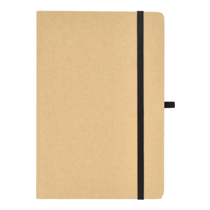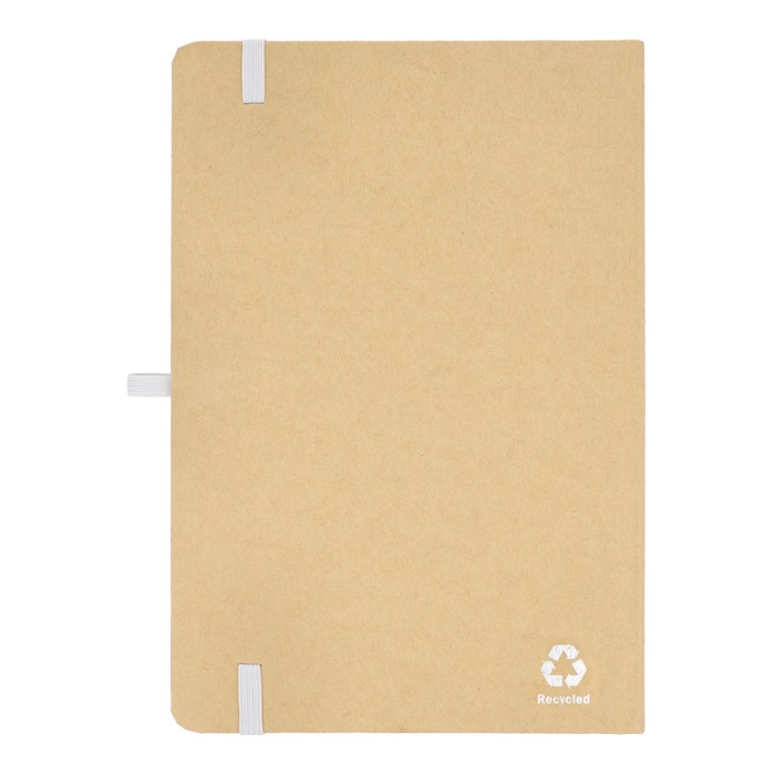 Taccuino A5 con copertina in cartone, angoli arrotondati, chiusura elastica colorata, nastro segnapagina e passante per la penna. Include 80 pagine foderate di colore crema realizzate con carta riciclata. Una scelta pratica ed ecologica per l'uso quotidiano.