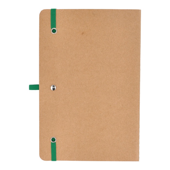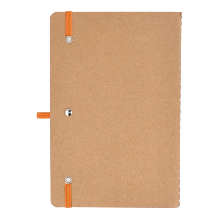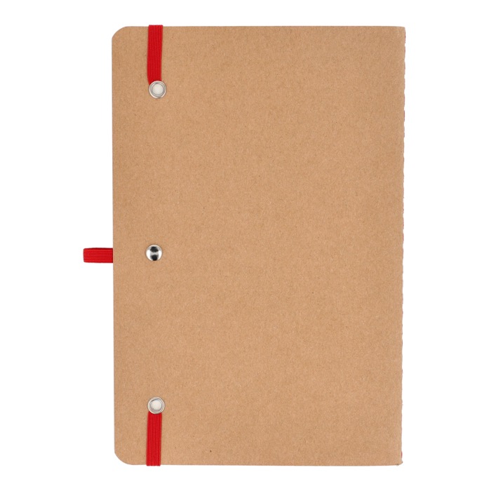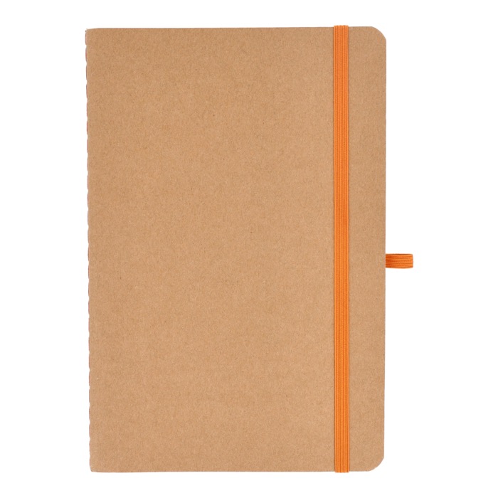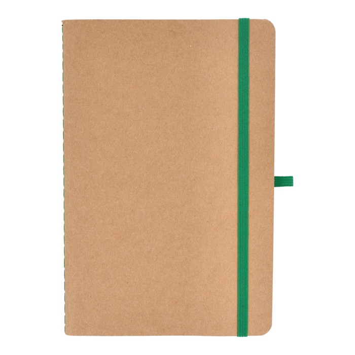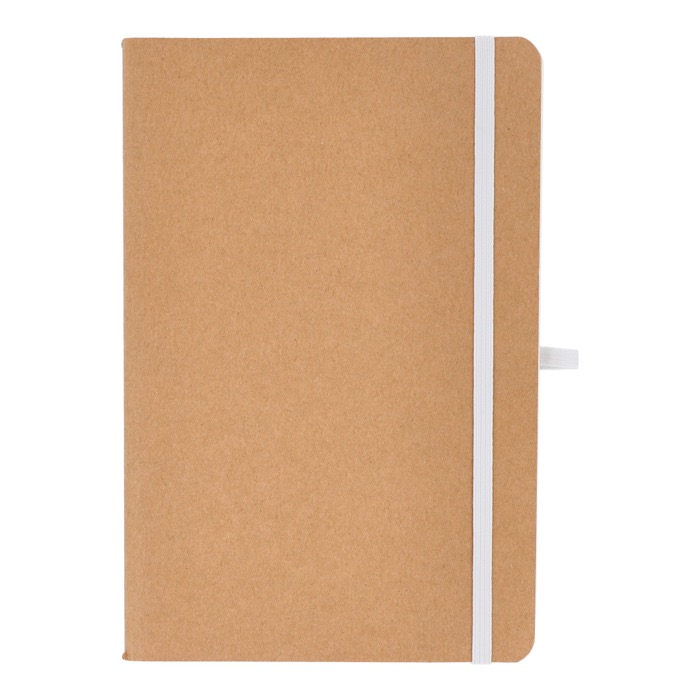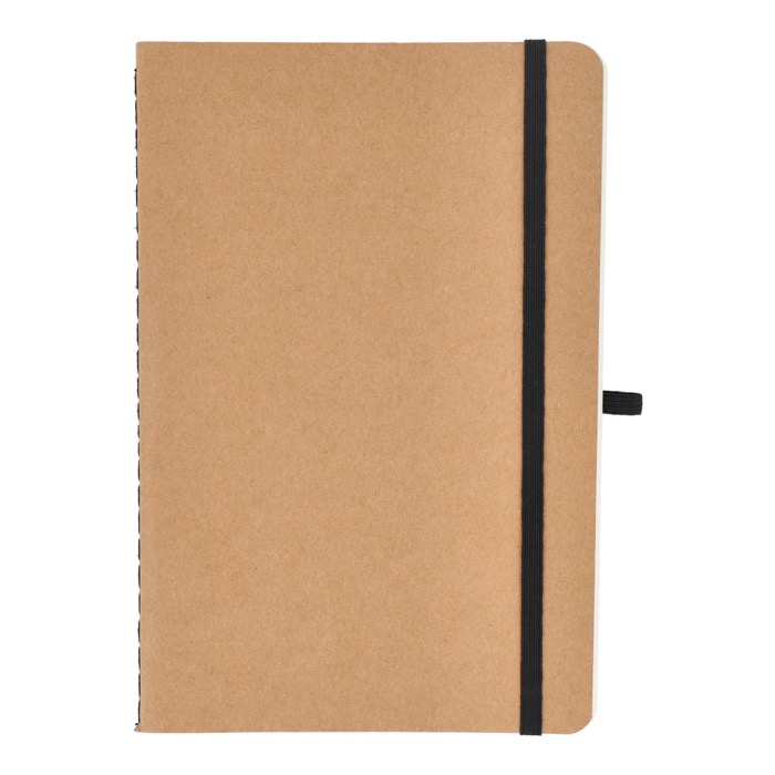 Taccuino A5 con copertina in morbida carta kraft, angoli arrotondati, chiusura elastica colorata e passante per la penna. Ha 60 fogli foderati di color crema realizzati con carta certificata FSC. Un'opzione pratica e dall'aspetto naturale per gli appunti quotidiani.