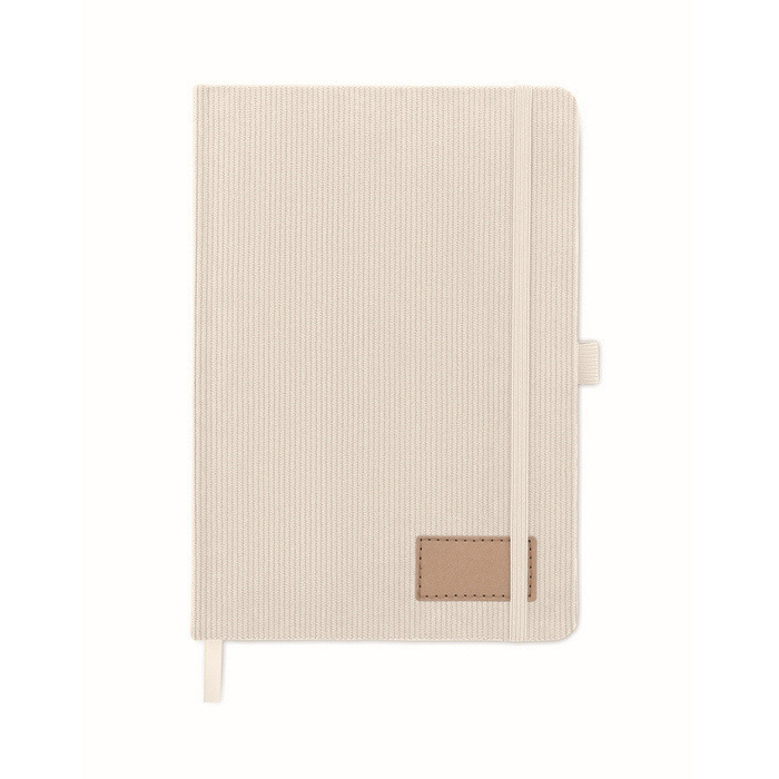 Taccuino A5 con copertina in velluto a coste rigido in poliestere RPET e design cartoné per un uso quotidiano in ufficio o durante visite commerciali. Include 192 pagine di carta riciclata a righe da 70 g/m², pensate per prendere appunti in modo ordinato in riunioni e corsi di formazione. Include una fascia elastica per tenerlo chiuso e un segnalibro a nastro per ritrovare rapidamente l’ultima annotazione. L’etichetta in carta kraft lavata aggiunge una finitura discreta. Opzione pratica per kit di benvenuto, eventi e iniziative di brand.