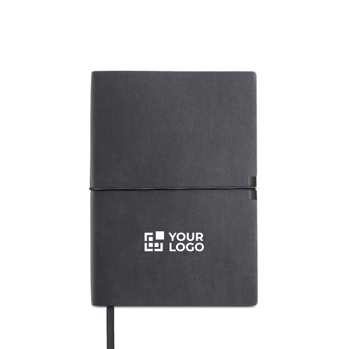Elegante taccuino A5 in similpelle con comodo elastico orizzontale.
