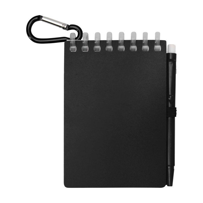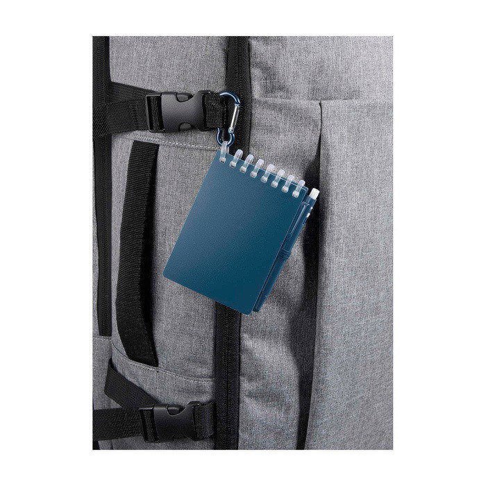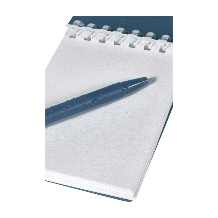 Set di taccuino e penna in plastica riciclata pensato per prendere appunti fuori dall’ufficio. Il taccuino con rilegatura a spirale include 70 fogli bianchi in carta di pietra resistente all’acqua da 120g/m², con angoli arrotondati e supporto integrato per avere sempre la penna a portata di mano. La penna coordinata, realizzata in plastica, scrive con inchiostro nero e offre una lunghezza di scrittura approssimativa di 250 metri. L’anello metallico facilita l’aggancio a zaino o portachiavi per attività di marketing itinerante.