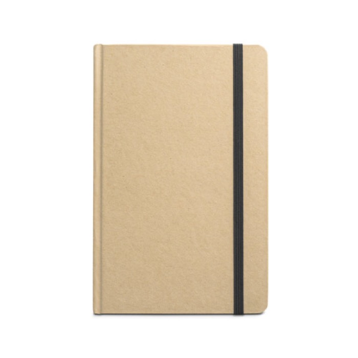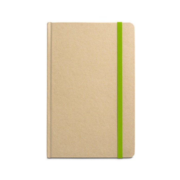 Taccuino formato A5 con 160 pagine a righe di carta riciclata e copertina in cartoncino rigido. Elastico di chiusura e nastrino segnapagina dello stesso colore.