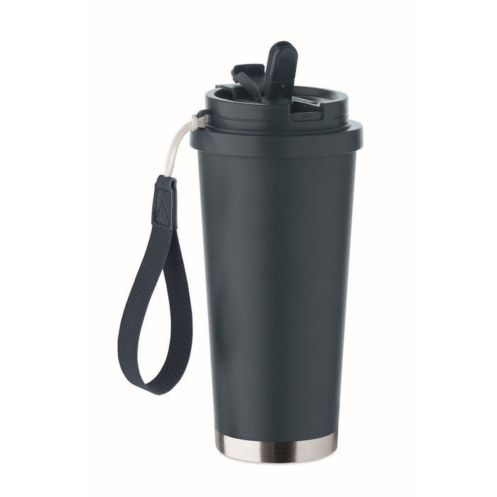 Bicchiere in acciaio inox riciclato con tappo 2 in 1 e cordino in RPET, con sistema antifuga. Un contenitore perfetto per qualsiasi attività all’aperto.