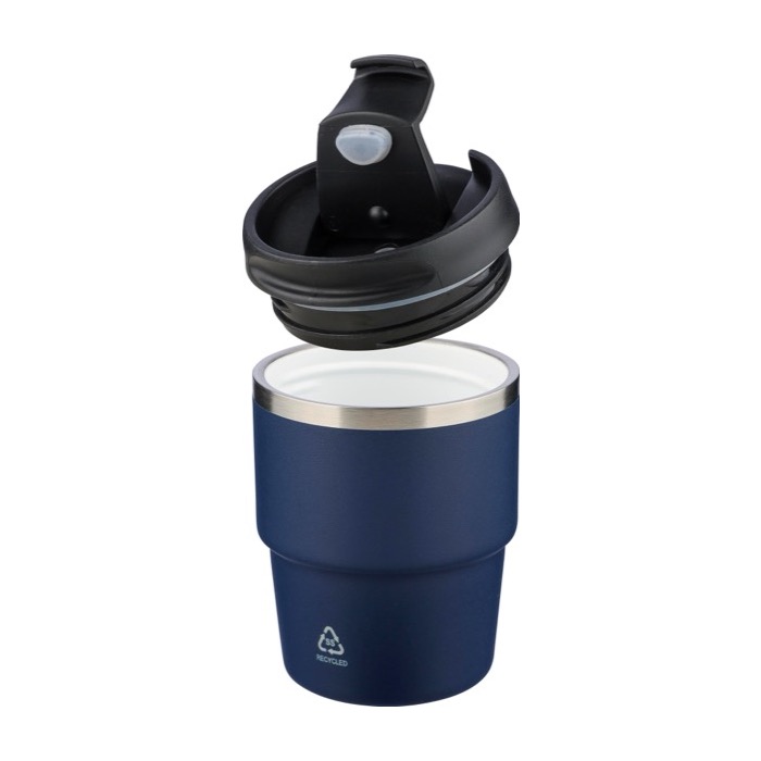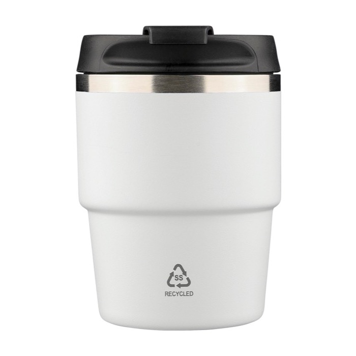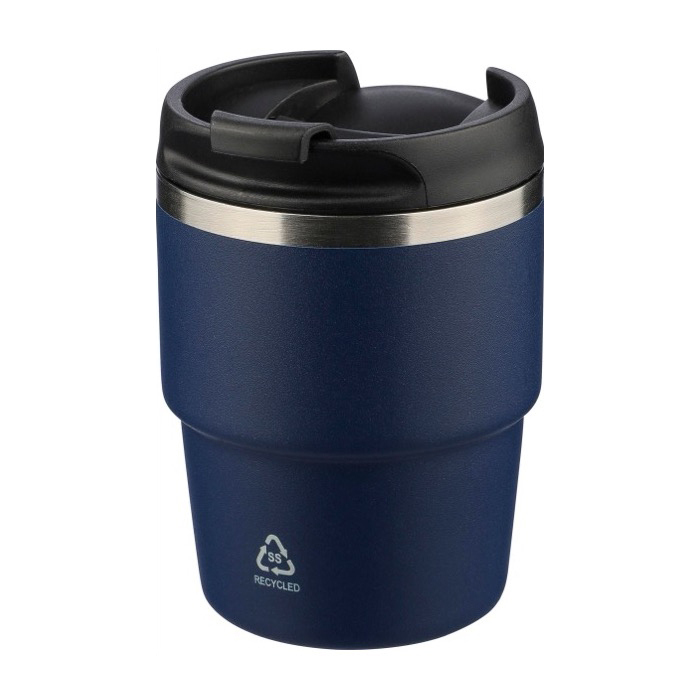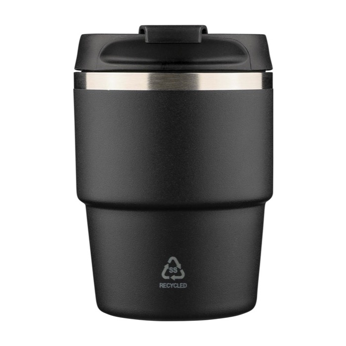 Vaso in acciaio inossidabile riciclato con doppia parete sottovuoto e tappo in plastica a vite per una chiusura sicura. L'interno in acciaio inossidabile 304 aiuta a mantenere la bevanda alla giusta temperatura più a lungo, mentre l'esterno in acciaio inossidabile 201 integra una finitura con rivestimento a polvere per una presa più salda. Formato compatto pensato per adattarsi alla maggior parte delle macchine da caffè. Include il logo dell'acciaio inossidabile inciso al laser sulla parte frontale e viene consegnato in scatola individuale di cartone marrone, utile per azioni aziendali.