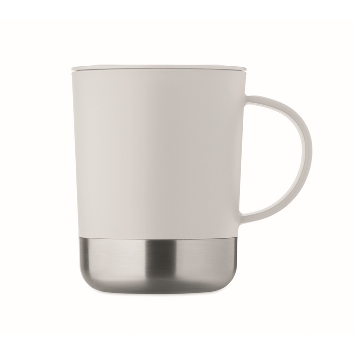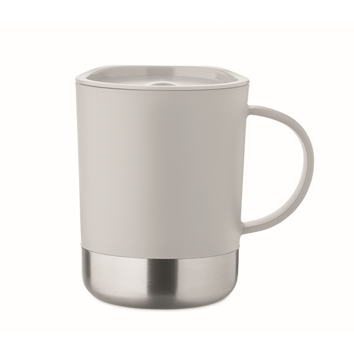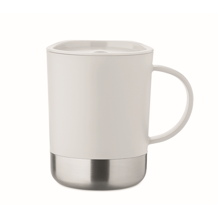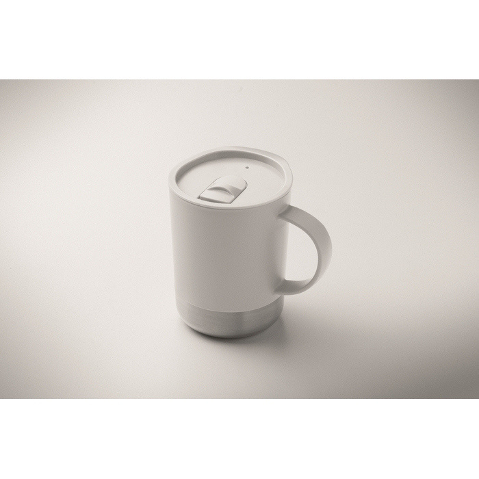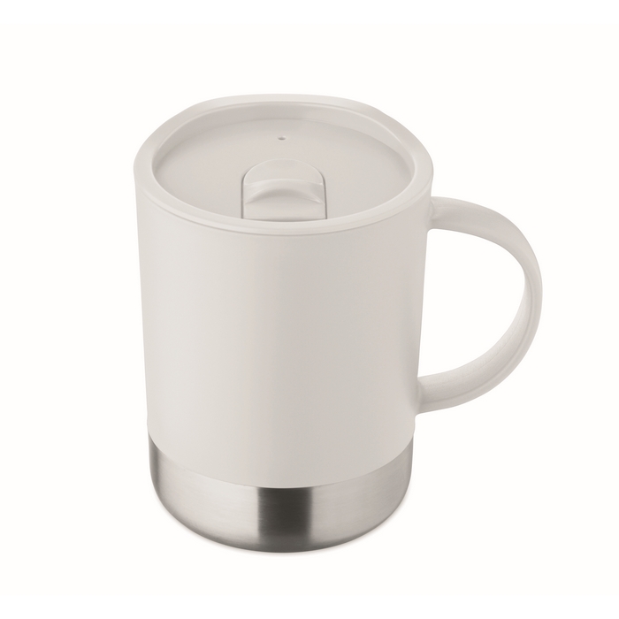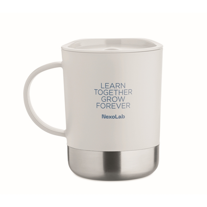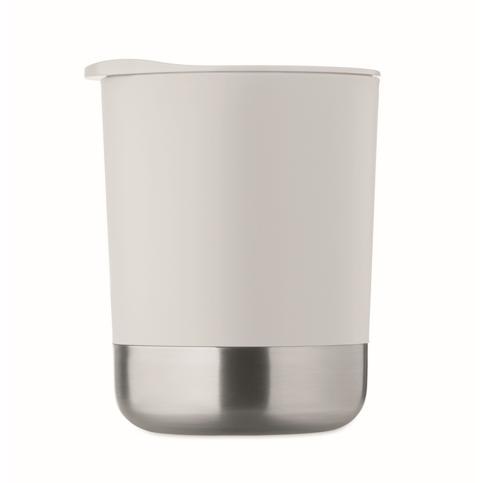 Bicchiere in PP con base in acciaio inossidabile riciclato (90% di acciaio inossidabile riciclato e 10% di acciaio inossidabile) e coperchio scorrevole in PP, pensato per l’uso quotidiano in ufficio o fuori. La capacità di 300 ml è pratica per caffè, infusi o bevande fredde. La base metallica offre stabilità su scrivanie e banconi, mentre il coperchio scorrevole aiuta a ridurre gli schizzi durante gli spostamenti. Opzione utile come omaggio aziendale o per azioni di branding.
