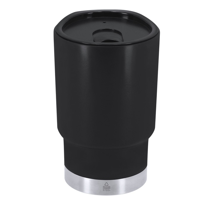 Bicchiere termico da 380 ml. Realizzato in resistente PP riciclato a doppia parete, in combinazione con base in acciaio inox riciclato. Coperchio con dosatore ad apertura facile, privo di BPA. Perfetto per la scrivania, il tavolo o qualsiasi superficie dove godersi comodamente la propria bevanda preferita. Con certificazione Food Grade, che garantisce la sicurezza a contatto con gli alimenti.