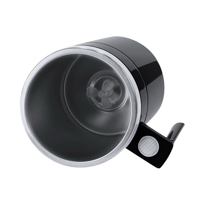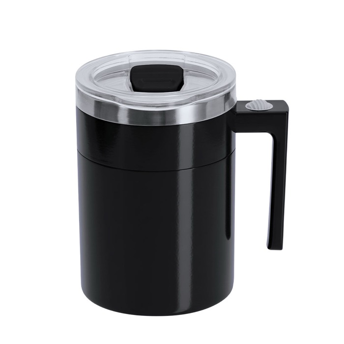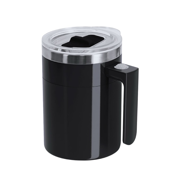 Tazza miscelatrice in acciaio inox da 400 ml, pensata per preparare bevande senza cucchiaio e con meno residui sul tavolo. Include un coperchio con beccuccio scorrevole per bere con maggiore comodità durante la giornata. Alla base interna integra un agitatore elettrico e si attiva tramite il pulsante on/off situato sul manico. Funziona con 2 pile piccole AAA (non incluse), il che ne facilita l’uso in ufficio o in viaggio. Opzione pratica per iniziative HR e regali aziendali con personalizzazione.
