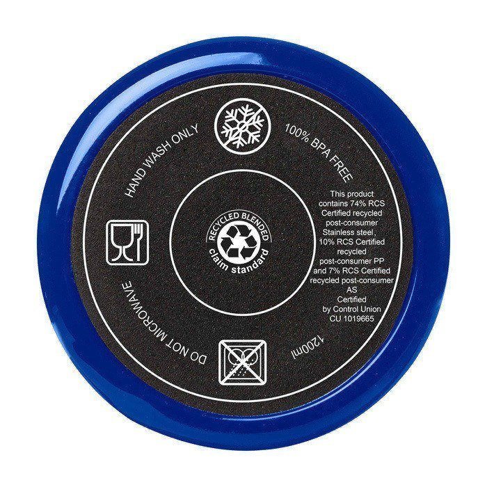 La tazza termica caratterizzata da una resistente struttura a doppia parete per mantenere le bevande calde o fredde in qualsiasi ambiente. La parete interna è composta da plastica riciclata e la parete esterna è realizzata in acciaio inossidabile riciclato certificato RCS. Ha una capacità di 1.200 ml, sufficiente per una perfetta idratazione per tutta la giornata. È caratterizzata da un coperchio a pressione a prova di schizzi con due aperture e chiusura girevole. Viene fornita con una cannuccia realizzata con materiale riciclato per alimenti. Lavarla solo a mano.