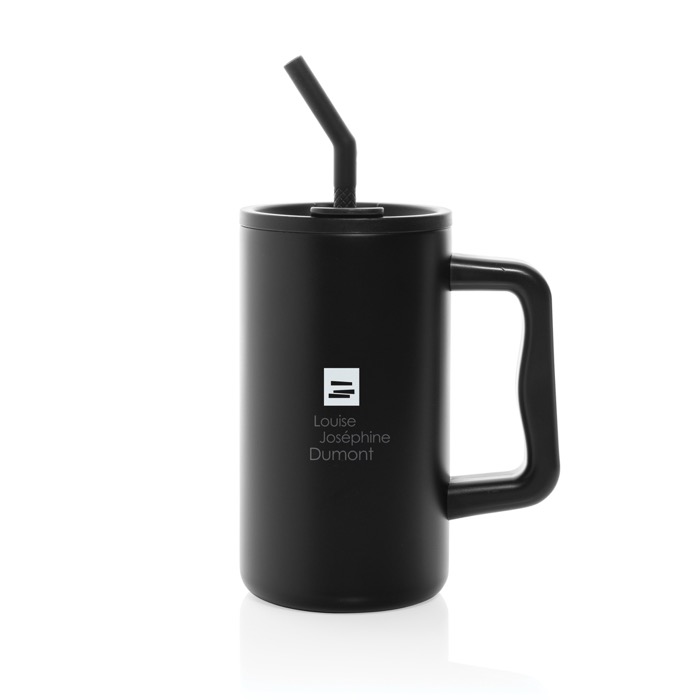 Tazza da 800ml, capiente e perfetta per la scrivania dell'ufficio. Il suo manico robusto e l'ampia base la rendono un compagno ideale per il consumo quotidiano di acqua in ufficio. Realizzata in resistente acciaio inossidabile riciclato, è progettata per soddisfare le tue esigenze di idratazione. Questa robusta tazza a doppia parete, isolata sottovuoto, mantiene la temperatura delle bevande fredde o calde per ore. È dotata di un tappo sicuro, di una cannuccia con beccuccio di silicone. Per una cura ottimale, si consiglia di lavarla a mano e non in lavastoviglie. Non inserirla nel microonde. Consegnata in scatola di cartone.
