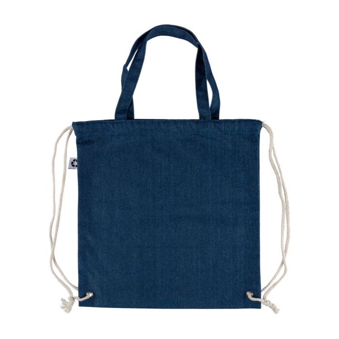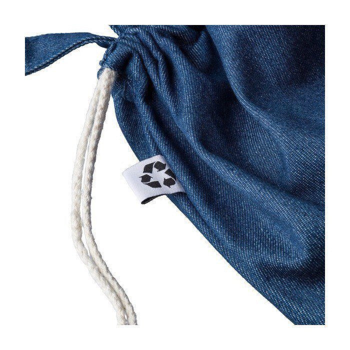 Zaino a sacca in denim riciclato con chiusura a cordoncino, pensato per l'uso quotidiano in fiere e azioni di marca. Offre un formato ampio di 40 x 38 cm. Integra manici lunghi da 2,5 x 50 cm e permette di portarlo sia con i cordini a spalla che a mano. Include etichetta esterna del riciclo e viene consegnato senza imballaggio individuale. Opzione pratica per eventi, negozi e campagne con logo.
