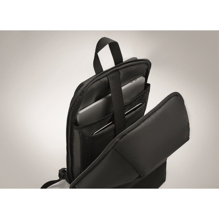 Zaino antifurto per laptop 15'' in poliestere RPET 600D. Vari scomparti, tra cui uno imbottito per tablet. Spallacci imbottiti e scomparto principale nella parte posteriore.
