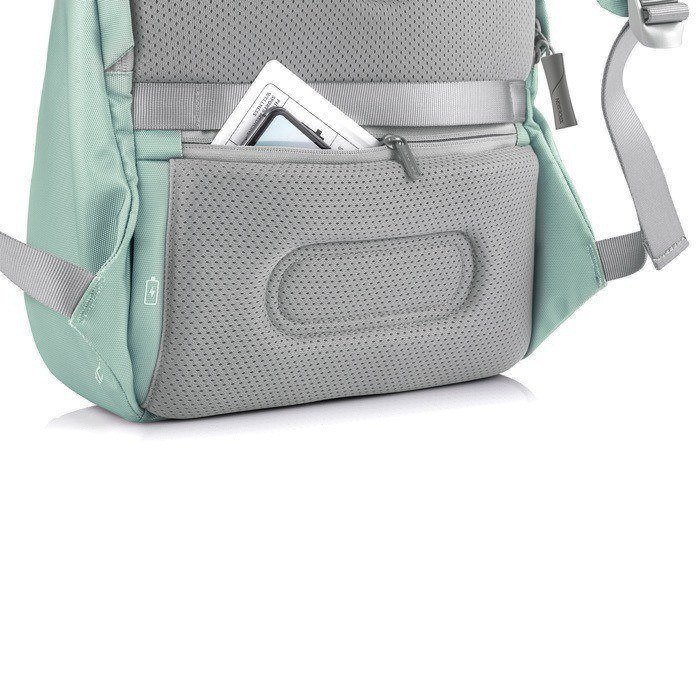 Zaino antitaccheggio con tasche nascoste e RFID, senza accesso frontale e cerniere nascoste è dotato anche di tiralampo di sicurezza per lo scomparto principale per mantenere le tue cose ancora più al sicuro. Nello scomparto principale c'è una tasca porta pc da 15,6”, piccoli taschini e ad una clip portachiavi. La parte superiore è espandibile regalando così spazio aggiuntivo. Include anche una porta di ricarica USB ed è impermeabile. E' realizzato in materiale R-pet con tracer Aware™. Lo zaino è realizzato dal riciclo di 38 bottiglie di plastica risparmiando 22L di acqua per ogni zaino prodotto. Design registrato®