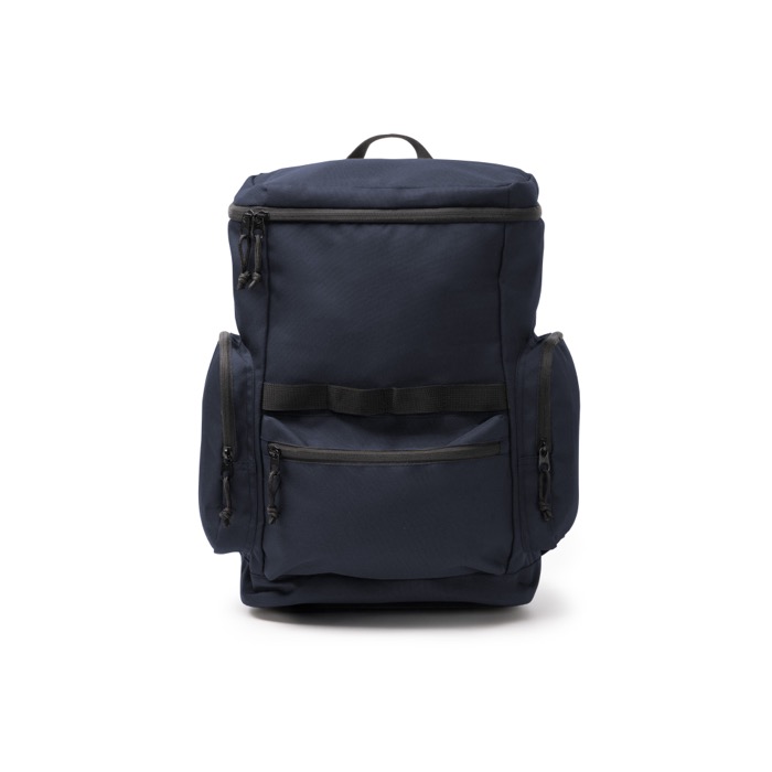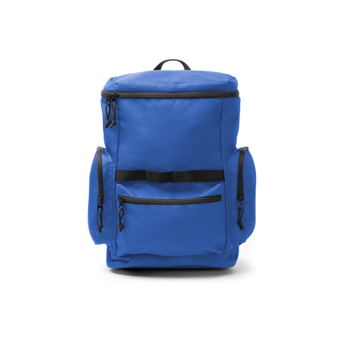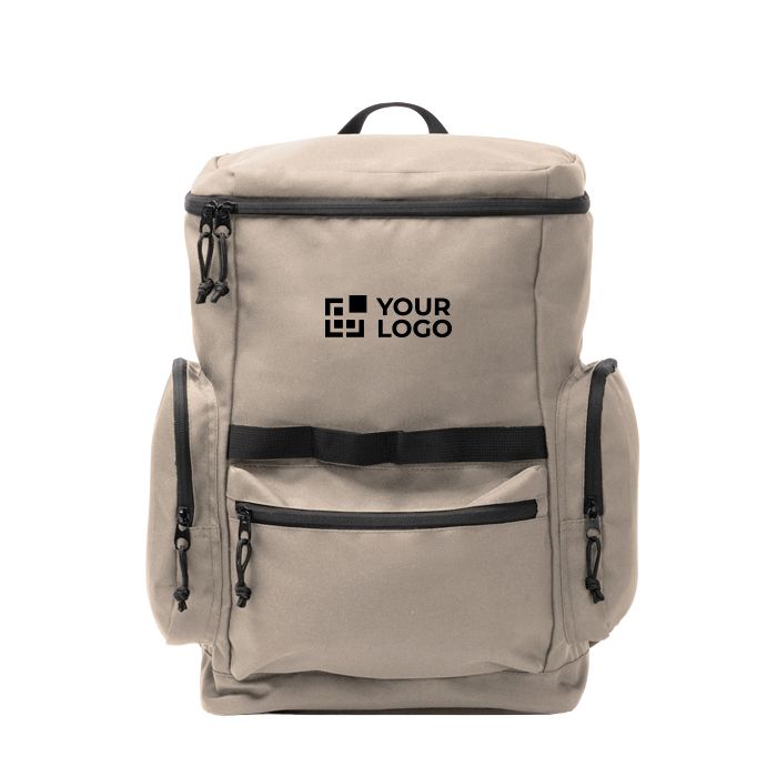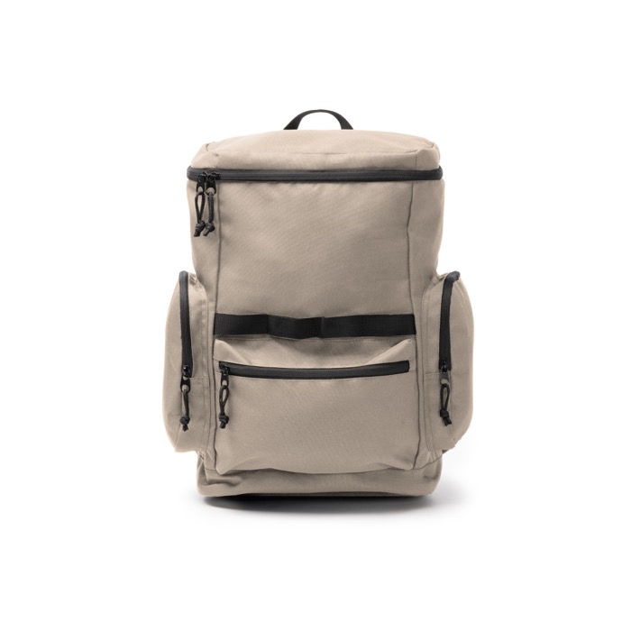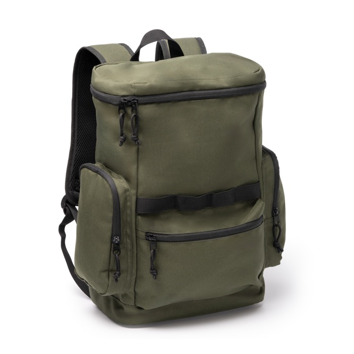 Zaino in plastica riciclata RPET 600D con apertura superiore per un accesso rapido al contenuto. Include tasche esterne laterali e una tasca frontale con chiusura a zip e tirazip neri, pensate per organizzare gli oggetti di uso quotidiano. Aggiunge diversi punti di ancoraggio per fissare accessori in base all’attività. All’interno è presente uno scomparto elastico per trasportare dispositivi fino a 12". Schienale e spallacci imbottiti per un utilizzo confortevole durante spostamenti ed eventi aziendali.